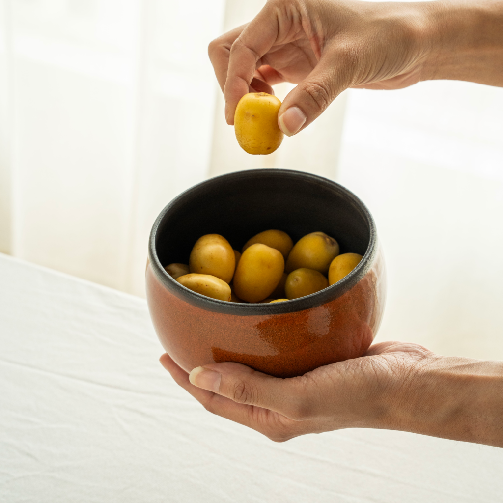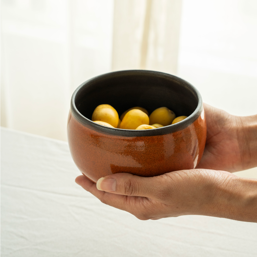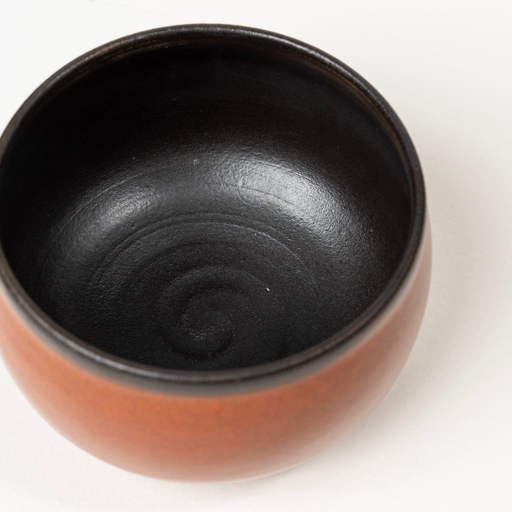 The unique burnt orange exterior and contrasting black interior give it a subdued vibrance and modern chic charm. The unglazed foot helps it stay balanced on any surface. Pair it with the Burnt Orange Mug for a delicious breakfast time!