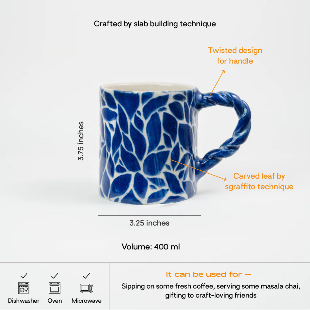 A handcrafted masterpiece, this mug features the Sgraffito technique, where the artisan etches intricate details into moist clay, and later unveils contrasting layers beneath.