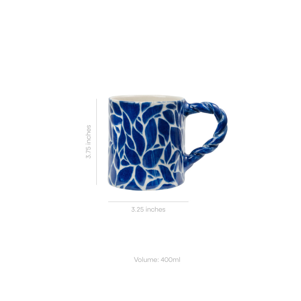 The organic, deep blue leafy pattern on a white canvas is reminiscent of midnight in the forests. The twisted handles, resemble vine tendrils, offering both good grip and a visual counterpoint to the intricate leafy pattern.