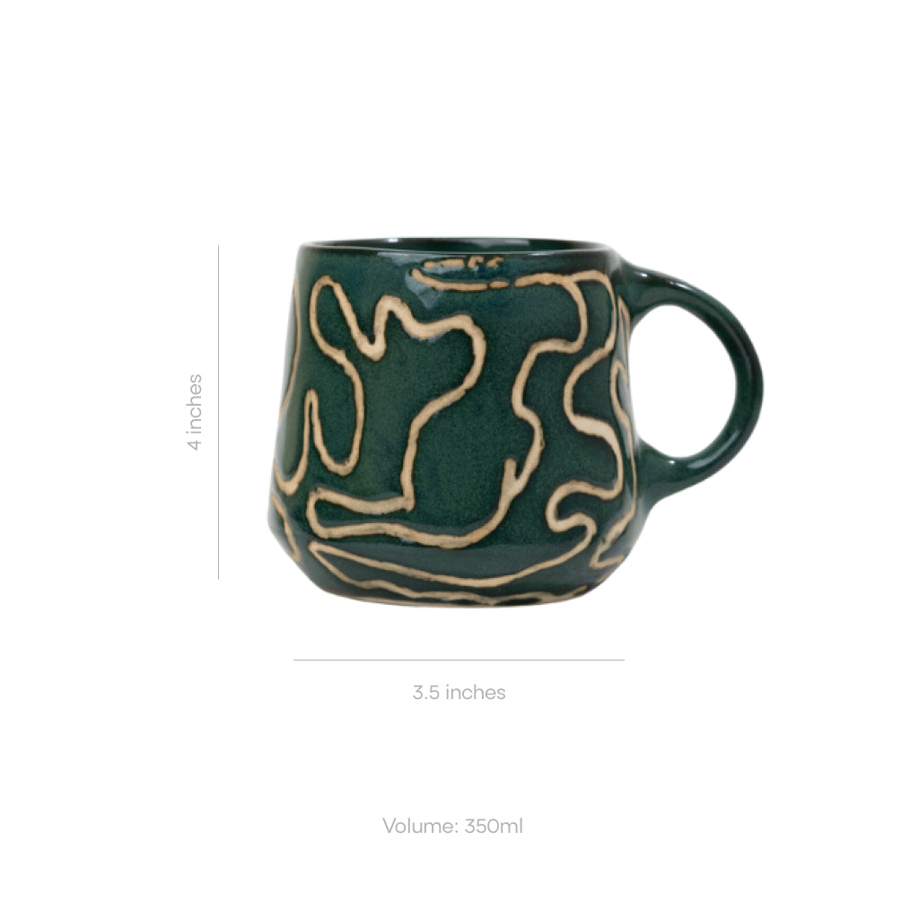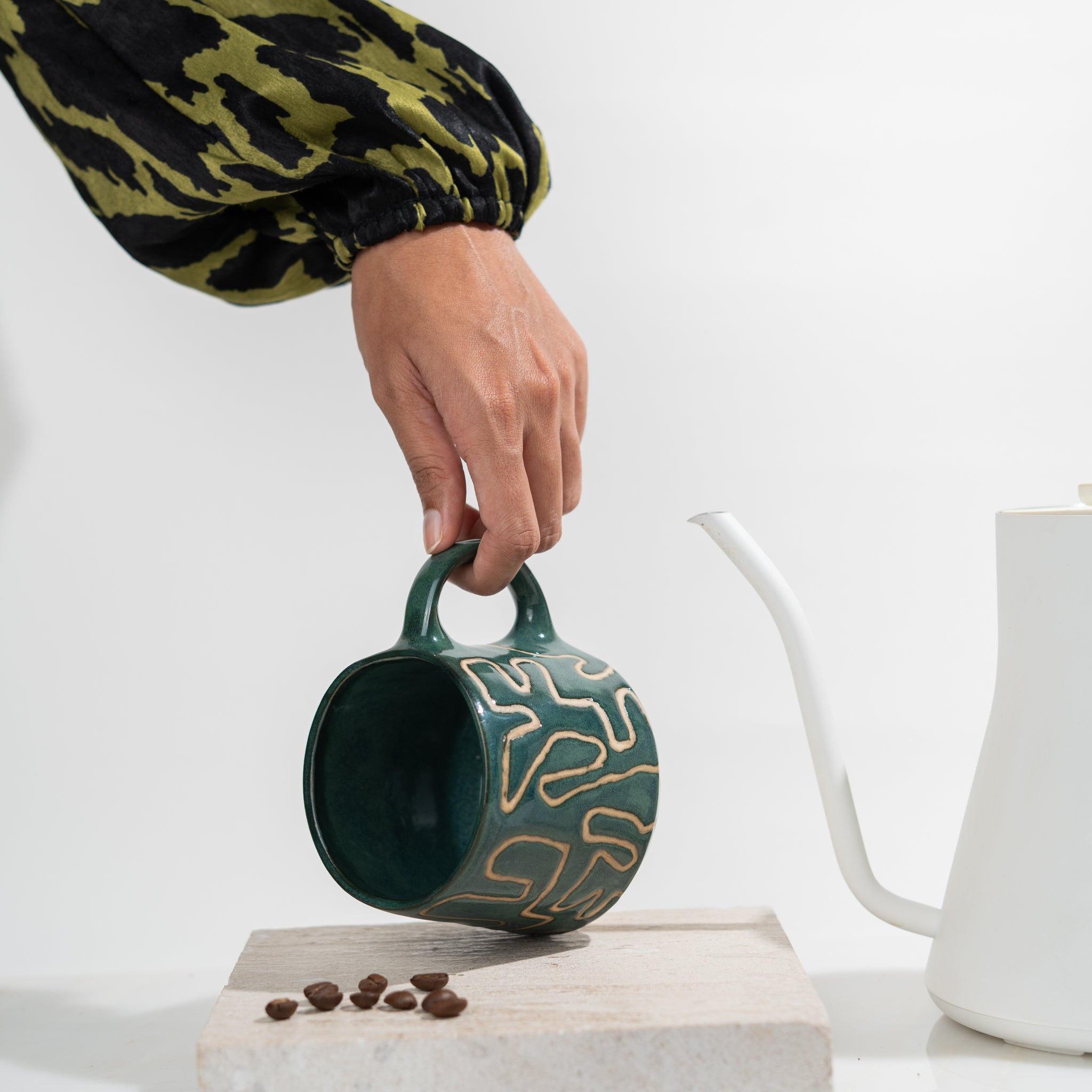 The galaxy mug is a mesmerising piece that captures the beauty of the cosmos in a cup. The rich emerald green glaze of this mug creates a striking backdrop for intricately carved golden ripples dancing across the surface. Its wide base and sturdy handle allow you to enjoy your morning coffee, a soothing tea, or any other favorite beverage with the perfect balance of aesthetics and functionality.