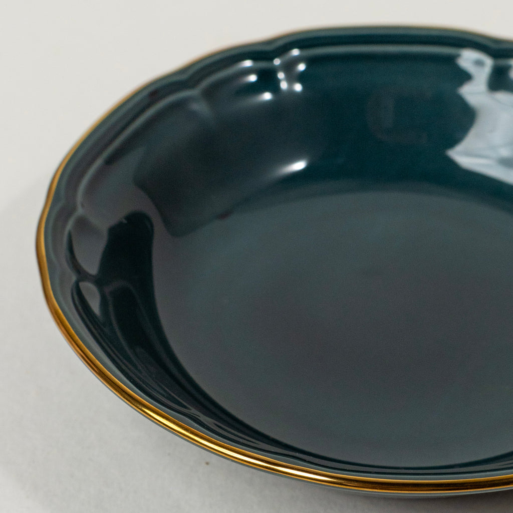 A contemporary take on age-old Japanese craftsmanship, the Provence Teal collection blends innovation with tradition. This bowl, with its unique form, rich teal hue, and soft curves, is accented with a delicate gold rim, adding subtle elegance to your dining table.