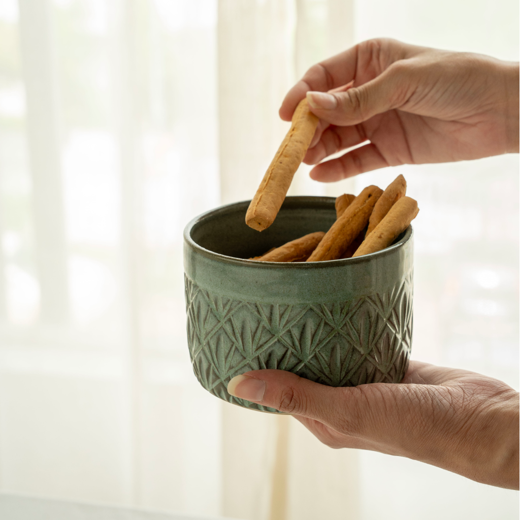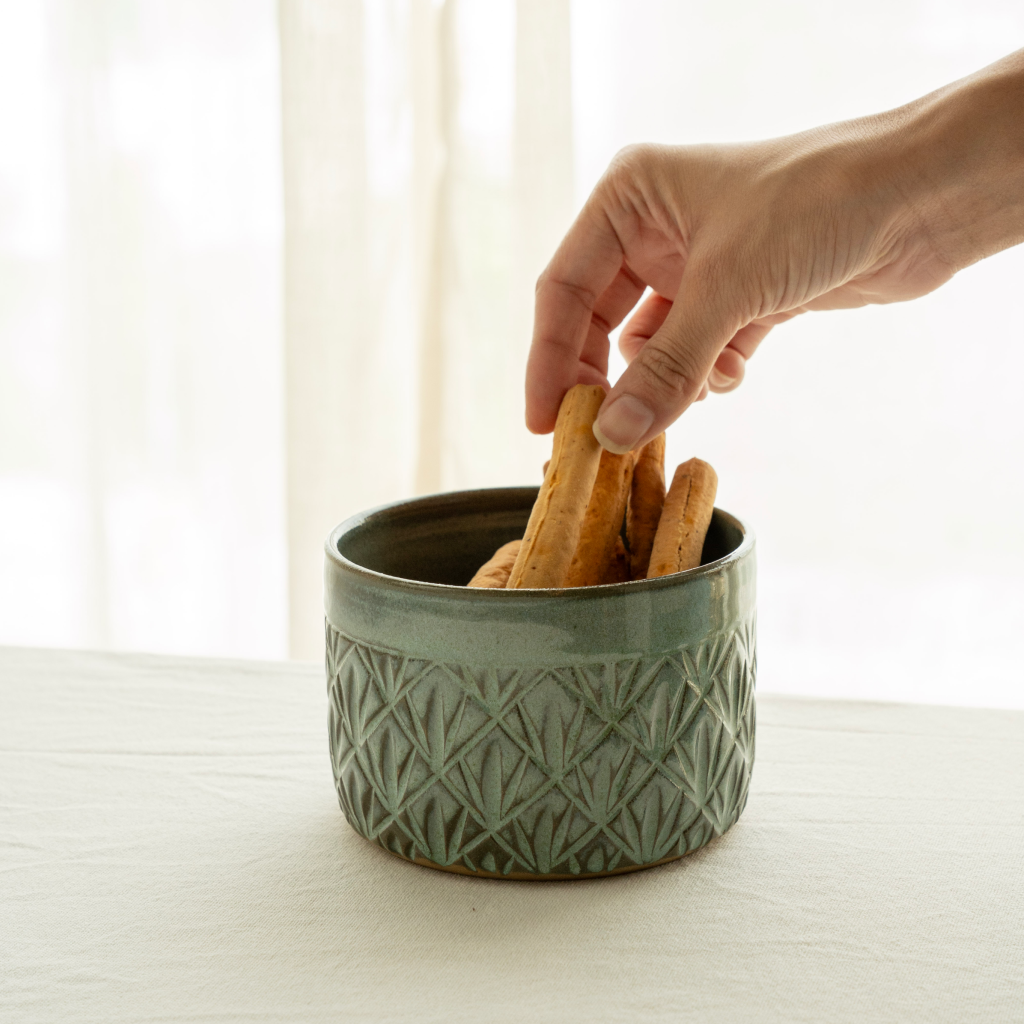 Inspired by the sculptural form of the agave cactus, this hand-carved ceramic bowl features rhythmic, organic patterns that echo the symmetry and strength of desert flora. Finished in a cool sage glaze, it brings quiet elegance to your everyday table.